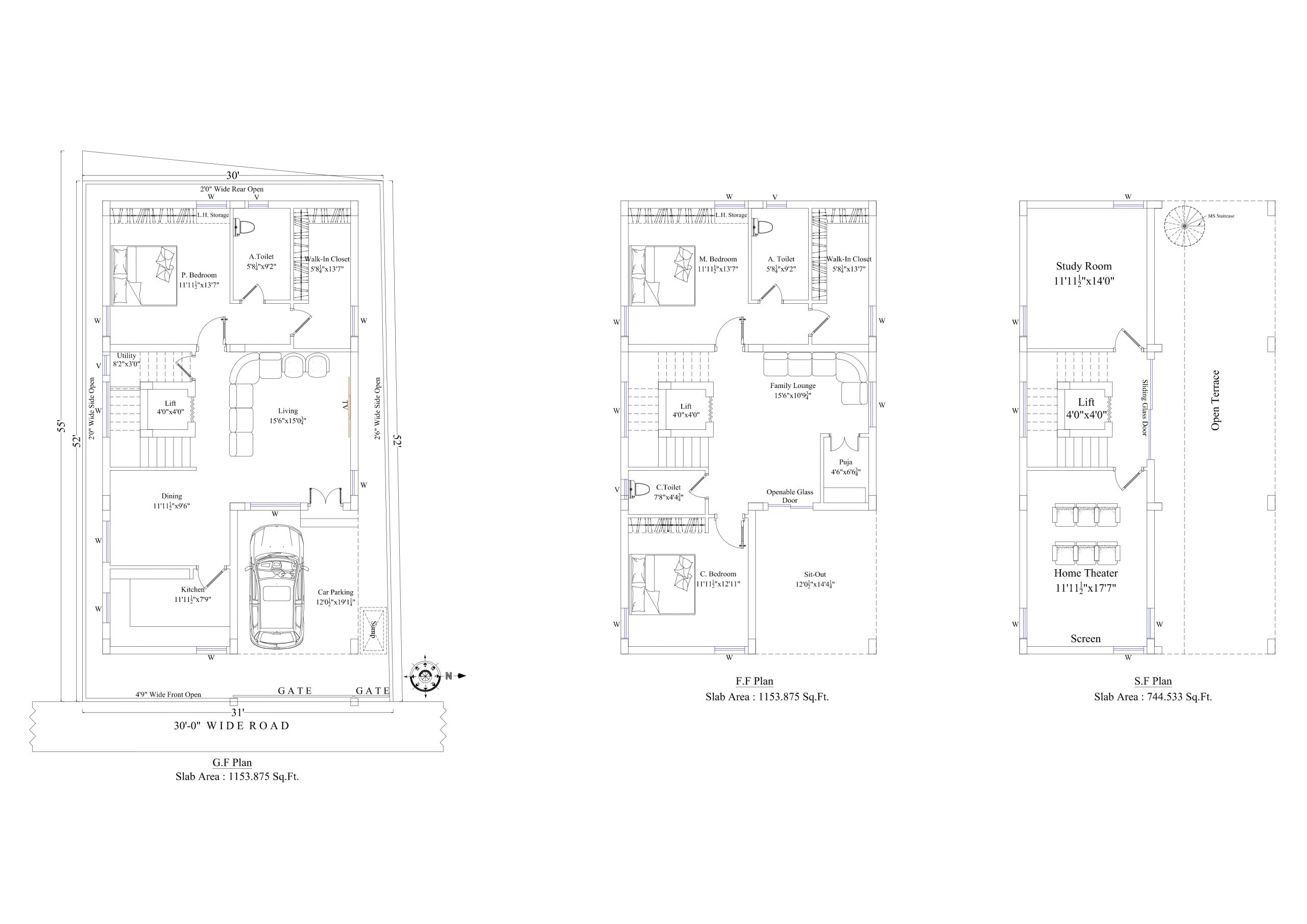 The plot dimensions are 30 feet by 52 feet, with a road on the east side, providing a total area of 1560 square feet (173.33 square yards).